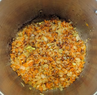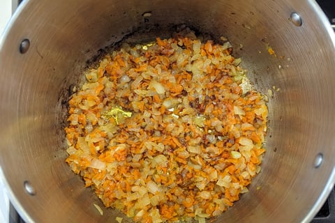 Heat up a large pot on your stovetop. Once hot, add a dollop of butter and add shredded carrots and onion. Cook until caramelized.