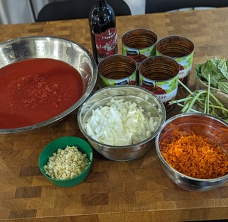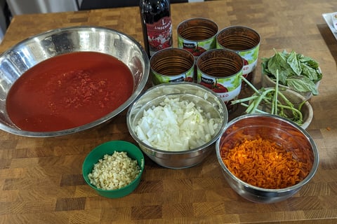 Add minced tomatoes and wash out aluminum cans with half the volume of water and add to the pot.