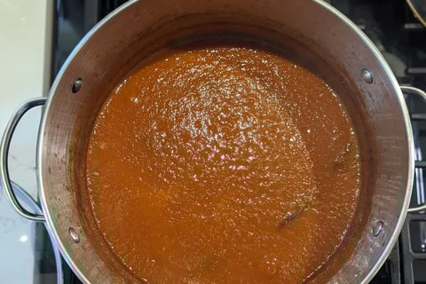 After cooking and reducing for a couple hours to your desired consistency.